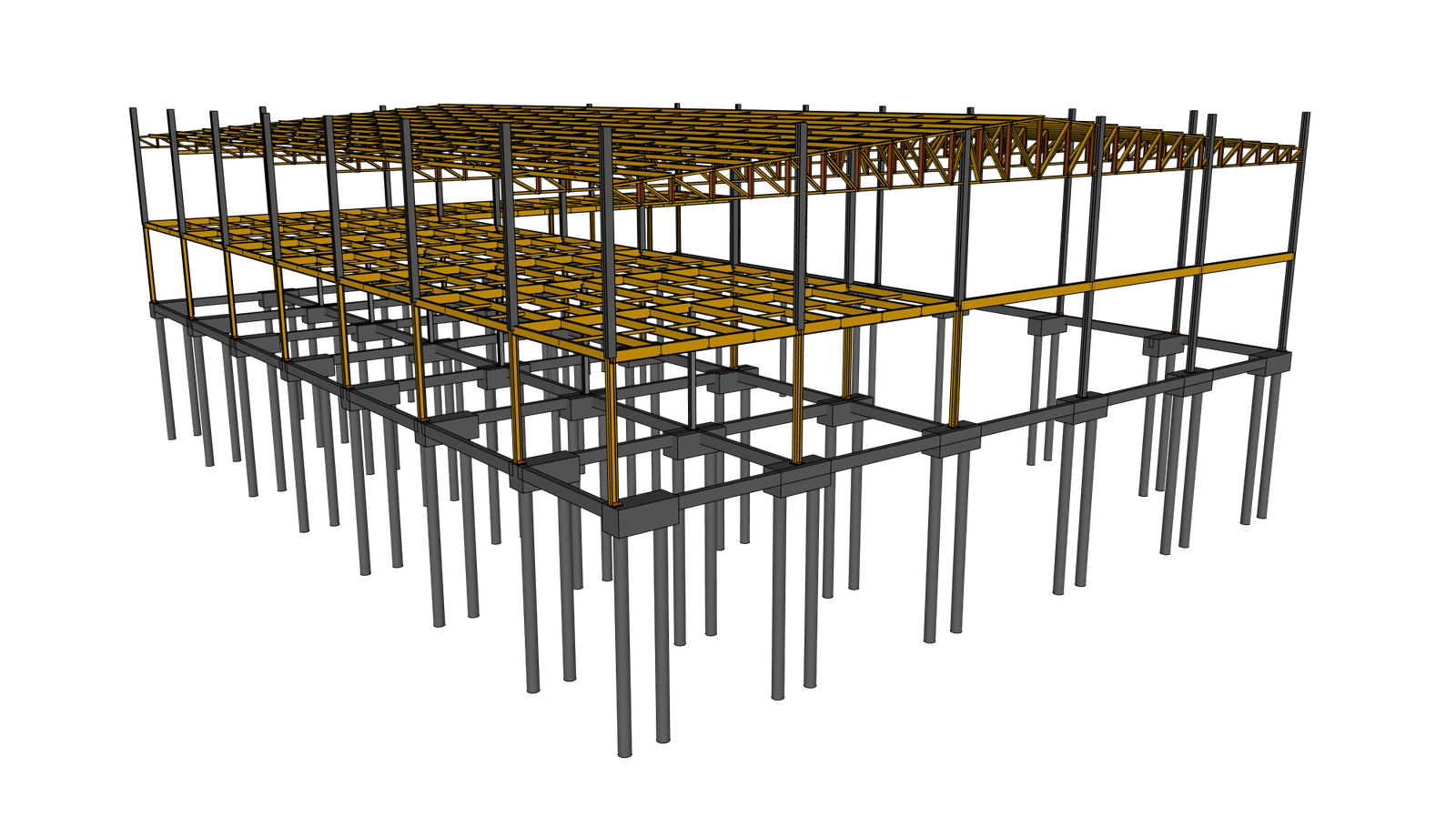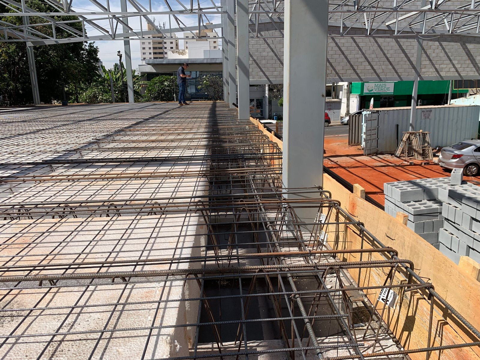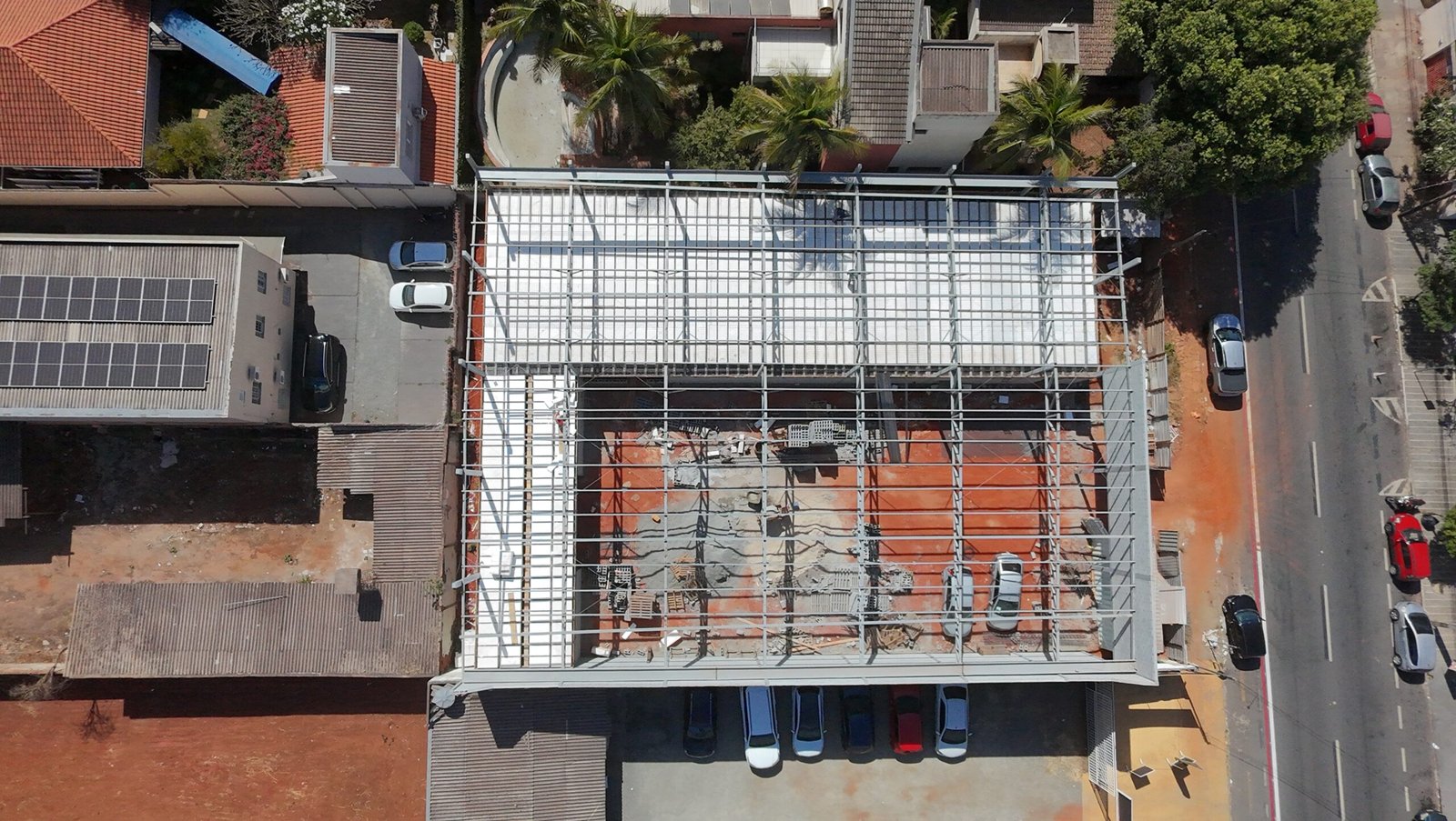 Para atender as necessidades de utilização desta academia com grandes cargas e grandes vãos, nossa concepção estrutural aliou estrutura metálica e laje com vigotas protendidas. Unindo o que cada material proporciona de melhor no seu desempenho, utilizamos pilares e vigas em perfis metálicos laminados para sustentar a laje protendida com mais de 10 metros de vão livre. Assim, garantimos um estacionamento coberto em laje, sem pilares intermediários, e ainda, atendemos o objetivo de uso de academia sobre a laje.