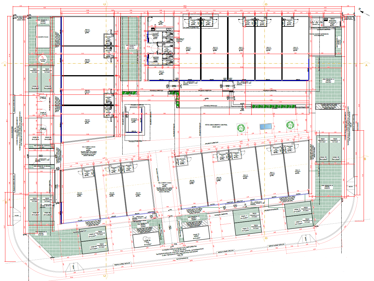 Texto/Descrição: O projeto consiste em um centro comercial a céu aberto, formado por 18 salas amplas que integram usos de lazer e conveniência em torno de uma praça de alimentação central. A proposta arquitetônica foi pensada para estimular a convivência e a fluidez entre os espaços, com áreas abertas e conectadas que favorecem a circulação e a permanência dos usuários. Foram elaborados os projetos de arquitetura, instalações e estrutural.