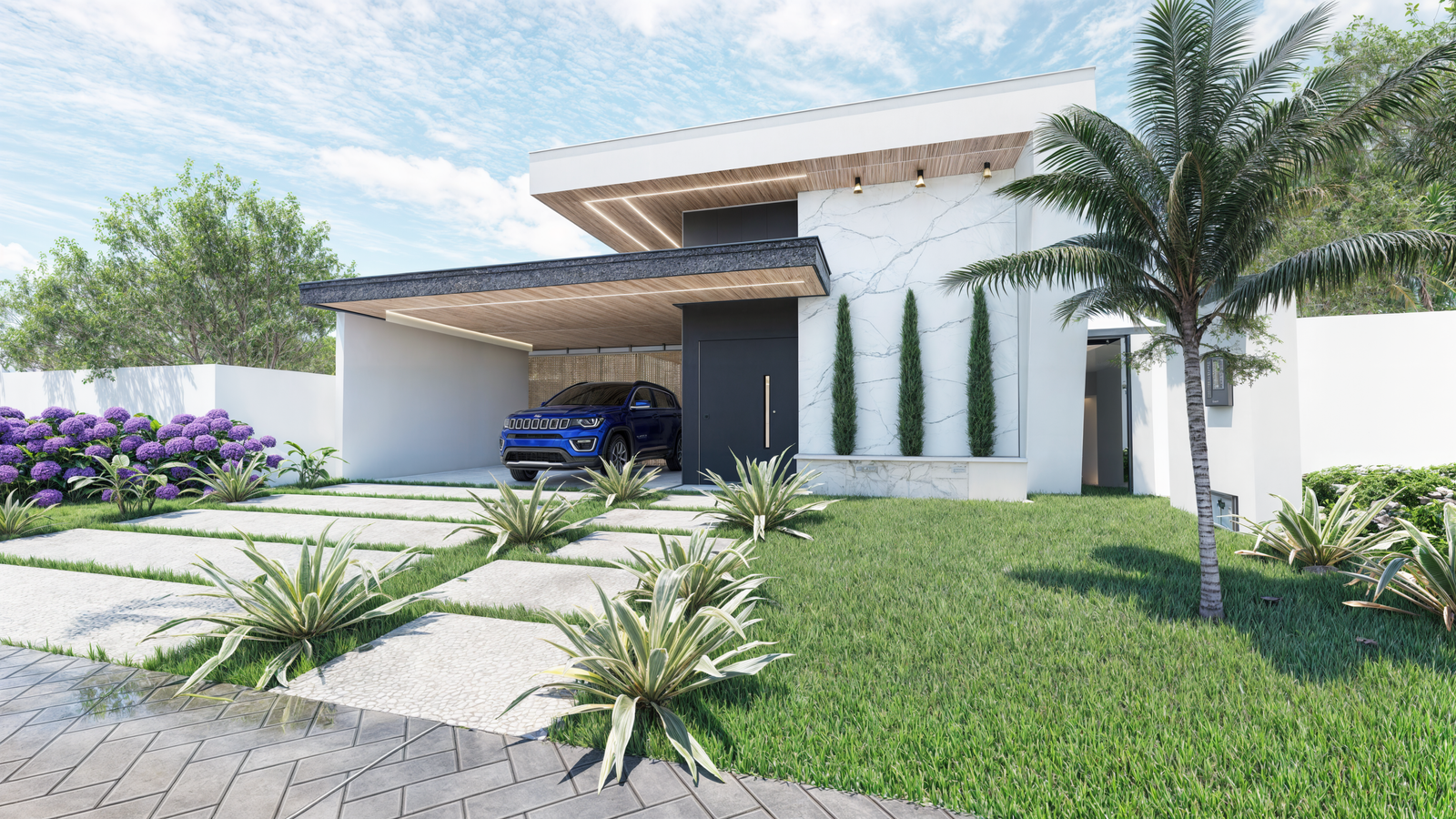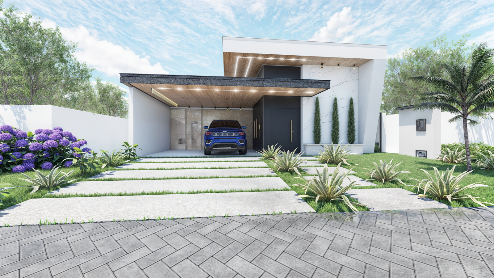 Projeto de residência unifamiliar térrea em condomínio fechado. Foram elaborados os projetos de arquitetura, interiores, instalações e estrutural.
