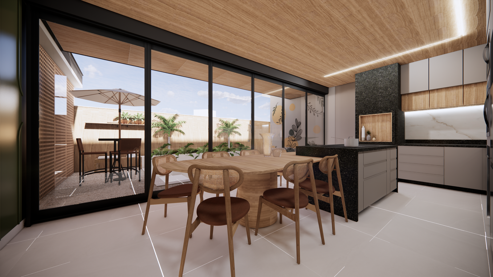 A proposta adota materiais naturais e setorização da casa em setor social e setor privativo.